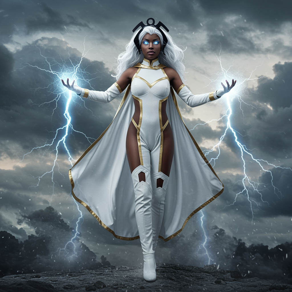 Transform into an extreme vivid fantasy realism style artwork, a masterpiece capturing Storm from Marvel Inc. in hyper-realistic fantasy digital photography. The image is meticulously captured with precision, presenting Storm in a centered and perfect composition. Overexposed photography techniques create a striking and ethereal atmosphere, with sharp focus bringing out exquisite details. Her iconic white attire is highlighted with clear and bright elements. Her expressive eyes, filled with power and compassion, reflect the intricate details. The dynamic pose of Storm, with her flowing cape, seamlessly merges realism with fantasy. This visually stunning scene celebrates her essence of command and weather control in an imaginative setting, set against a dramatic sky with swirling clouds and electric energy, adding a unique touch of creativity while honoring her formidable presence.