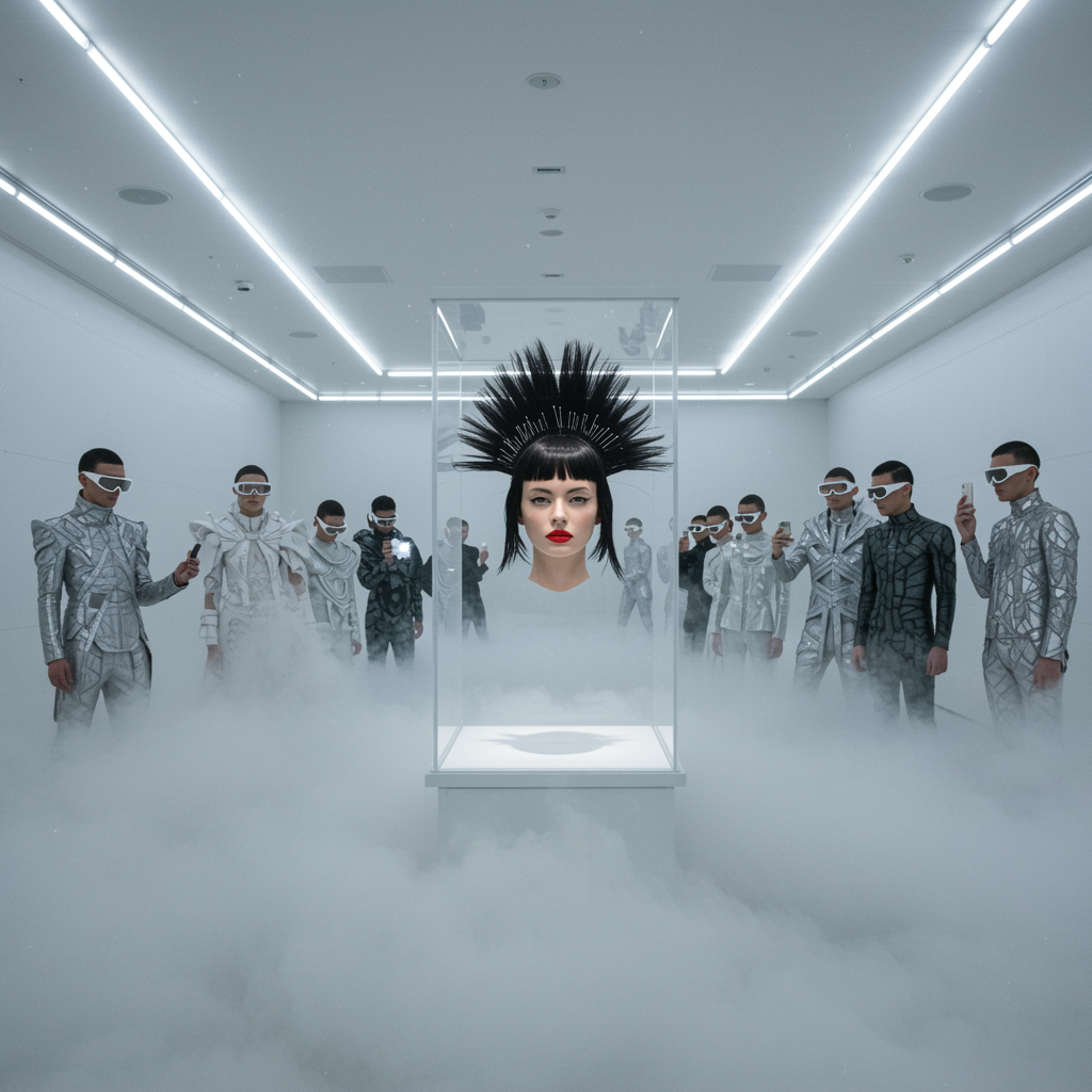 In a futuristic museum hall, a soft, drifting haze of smoke fills the air. The entire space is overwhelmingly white, creating a disorienting purity. Lengthy, continuous LED strips line the ceiling, their glow blending with the mist swirling at floor level, casting an ethereal, diffused light. The room is devoid of doors or windows, amplifying the surreal and otherworldly feel. At the center, a minimalist glass display case showcases a levitating female head with bold red lips and editorial-style makeup. Her striking contour and metallic highlighter accentuate her features, while an extravagant avant-garde wig of textured black hair with a short fringe and metallic pins interweaves into futuristic architectural shapes. The head floats mysteriously, with no visible body, only the captivating form suspended in mid-air. Around the display, elegantly dressed men and women in avant-garde, high-fashion futuristic attire gather in admiration, capturing the scene with their smartphones. Their outfits exhibit sculptural silhouettes, reflective metallic fabrics, exaggerated shoulders, high-neck collars, intricate laser-cut details, and asymmetrical designs. Some sport visor-like glasses and glowing accessories, while others wear gravity-defying structured garments. The bright flashes of their cameras reflect off the glass, creating a mesmerizing interplay of light and shadows. The ambiance is both eerie and captivating, blending high fashion, advanced technology, and an air of mystery. This fusion of futuristic aesthetics, editorial styling, and avant-garde fashion elements evokes the feeling of a high-end fashion editorial set in a distant future.