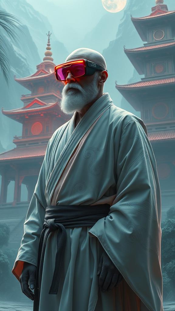 A hyper-realistic mystical and ethereal concept art painting depicting a serene zen roshi bounty hunter, donning futuristic sci-fi AR goggles and flowing zen robes. Subtle neon highlights accentuate the intricate designs on the robes, softly glowing in the ambient light. The bounty hunter stands composed and focused, exuding an aura of calm amidst chaos, surrounded by a surreal, dreamlike landscape that blends ancient temples with high-tech elements, capturing the harmonious balance of tradition and futurism.