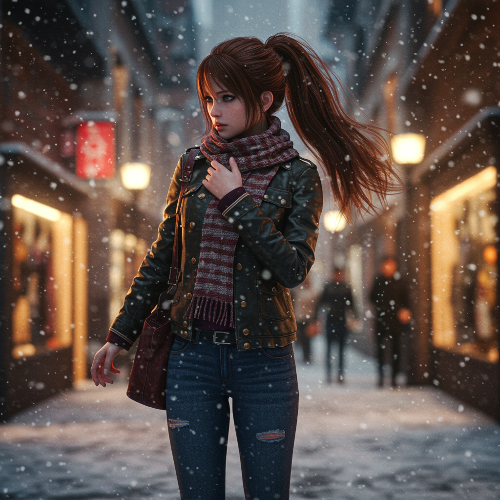 Cinematic shot, centered, low-angle perspective, dynamic pose, focused close-up, gothic girl, stunning, with a long chestnut ponytail, wrapped in a scarf, dressed in jeans and a leather military jacket, amidst a snowy blizzard in a bustling shopping district, city street backdrop, RAW photograph, enriched with volumetric lighting, global illumination, reflections, and bokeh effects, studio color palette, highly realistic, 64K resolution, HD quality, professional craftsmanship, rendered using Unreal Engine and Octane Render, inspired by Makoto Shinkai's style.