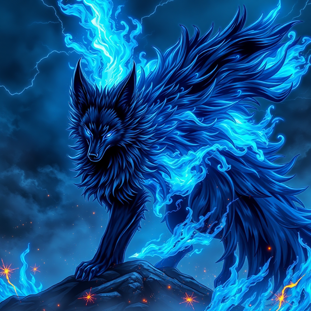 Majestic dark fox emanating deep indigo flames of mystical energy, anime style, 8K resolution, sorcerer-like humanoid male prince of shadows dominating the battlefield, surrounded by a stormy backdrop of azure infernal flames and electric sparks, apocalyptic, vibrant, intricate, and graceful, a digital illustration that captures a scenic, hyper-detailed panorama, under a thundering storm.