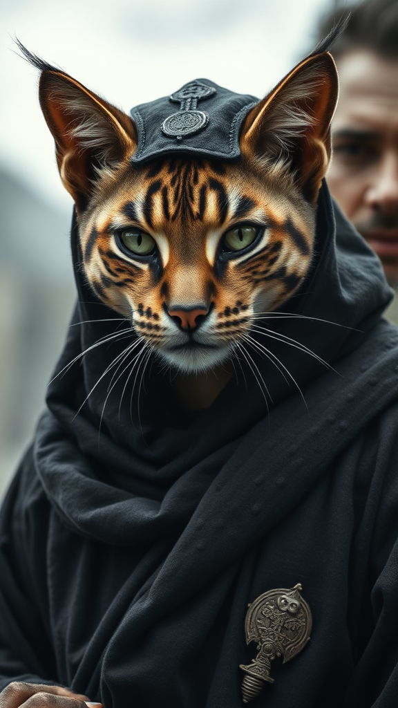 full-length portrait close-up photograph highly detailed feline facial features engaging with the camera head male humanoid body obsidian druid robes outdoors dramatic cinematic lighting vibrant pose fur trimmings intricate life-like realistic shaky sketch amateur artist monochrome understated plain background indistinct background noise uneven proportions fused fingers hood cap additional ears cool colors