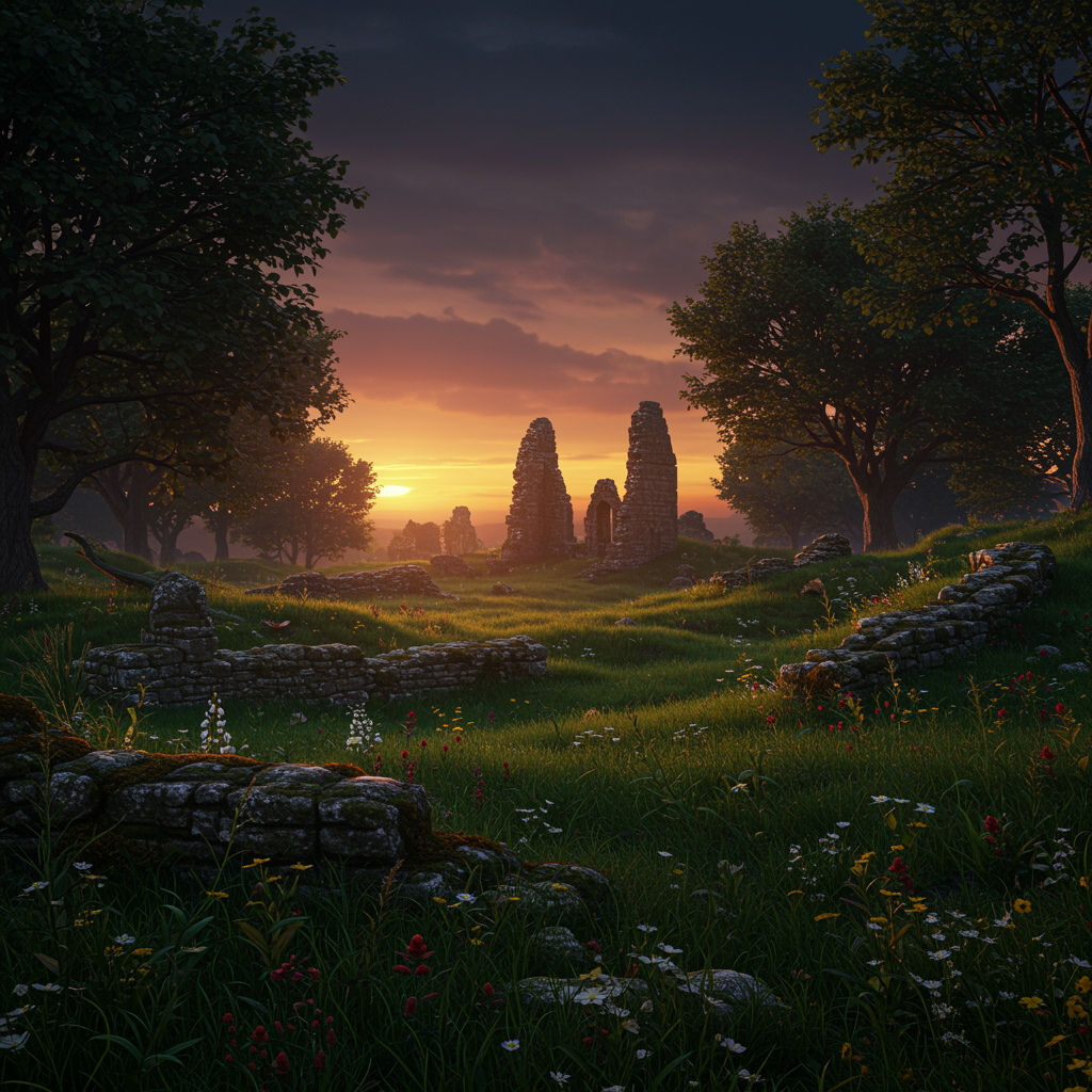 A mystical twilight descends over a fantastical, lush Celtic realm, where verdant grass and vibrant wildflowers entwine with ancient ruins. The horizon is painted with a deep, dusky hue, as a dark sunset casts long shadows over the overgrown kingdom. Majestic trees, their leaves whispering secrets of old, stand tall against the twilight sky, creating an enchanting tapestry of nature reclaiming forgotten lands.