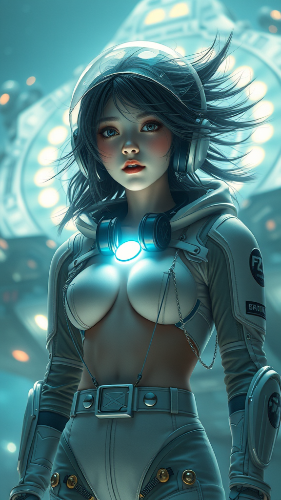 A stunningly beautiful girl clad in a spacesuit, set against the backdrop of a giant, hyper-detailed sci-fi minimalistic spaceship. The scene is reminiscent of Tsutomu Nihei and Sidonia no Kishi styles, offering maximum clarity and cinematic lighting. Her hair dynamically waves, revealing glowing features and a space helmet adorned with intricate piercings. A light emanates from her chest, accentuated by a hood and bright illumination, casting highlights on her form. She wears headphones over her bare neck, her silhouette defined by a slender frame with narrow hips. Her ensemble is embellished with gold rivets while maintaining symmetry. The image avoids any signs of deformation, poor anatomy, extra limbs, or distortion, emphasizing a clean, high-quality representation. There's no watermark or oversaturation, and the girl appears lively and vibrant, with a distinct, engaging expression.