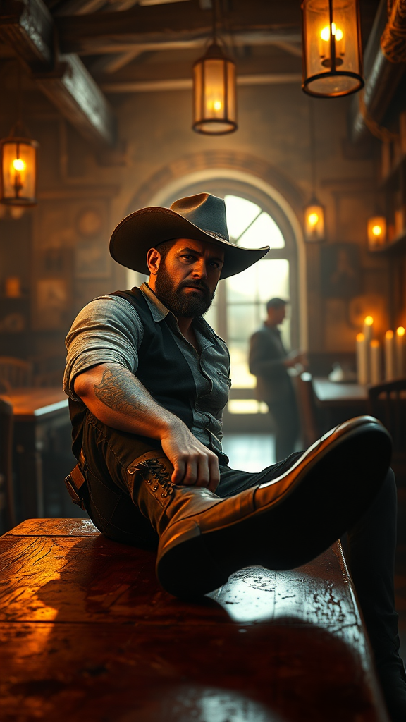 A rugged male cowboy in a classic western outfit with a wide-brimmed hat and a distinctive tattoo on his arm, leisurely seated in an atmospheric medieval tavern. His boots are casually propped on the wooden table amidst the ambient glow of cozy indoor lighting. The scene is captured as a detailed digital painting with a cinematic and hyper-realistic style, utilizing Unreal Engine and Octane rendering technology. Set against the backdrop of bright evening light, the concept art is designed in 4k and 8k resolution, ensuring the best photorealistic quality. The environment exudes a sense of warmth and history, featuring rich textures and intricate details that bring the tavern to life.