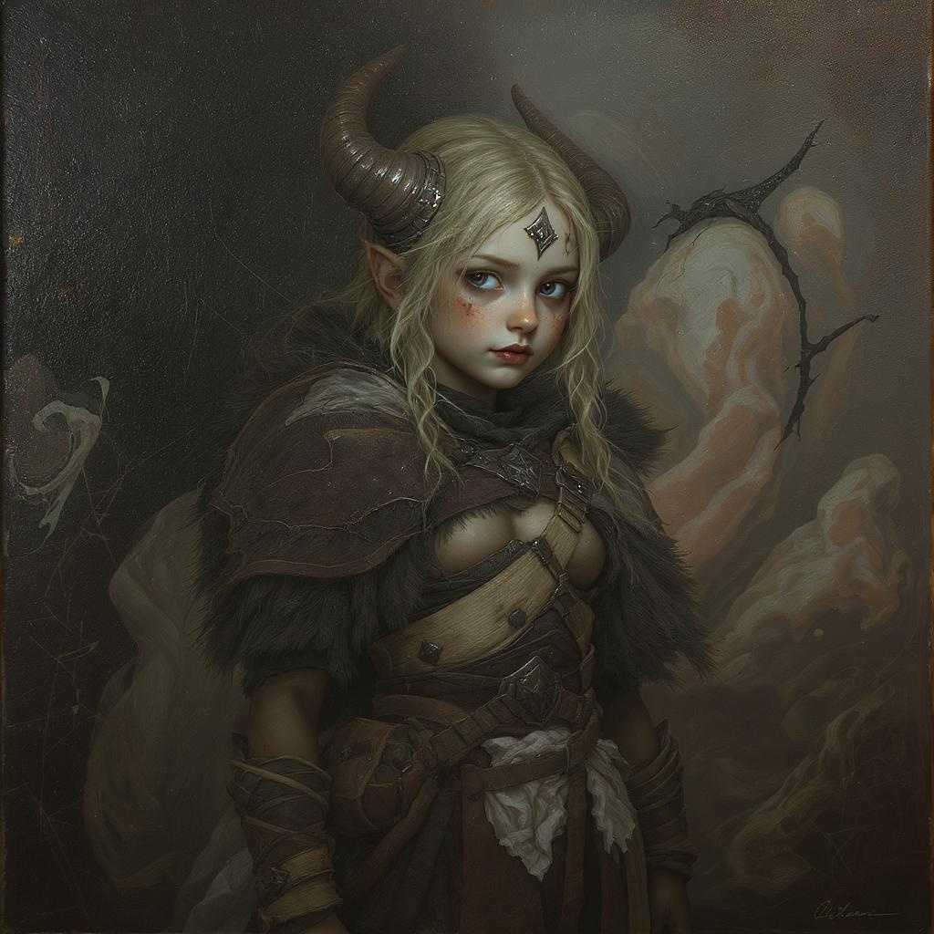 detailed full body concept art illustration, dark soft focus, plague-style oil painting on canvas of a little viking warrior girl in intricate clothing, biomutant, dystopian, micro detail, octane render, 4K, abstract, surreal, unique, imaginative, full character design, muted colors, fine art touch, dreamlike atmosphere, single cohesive figure, realistic proportions, harmonious composition, artful portrayal, subtly distorted realism, nuanced expression, seamless anatomy, ethereal presence, enigmatic essence, captivating features, soft edges, mystical ambiance, painterly texture.
