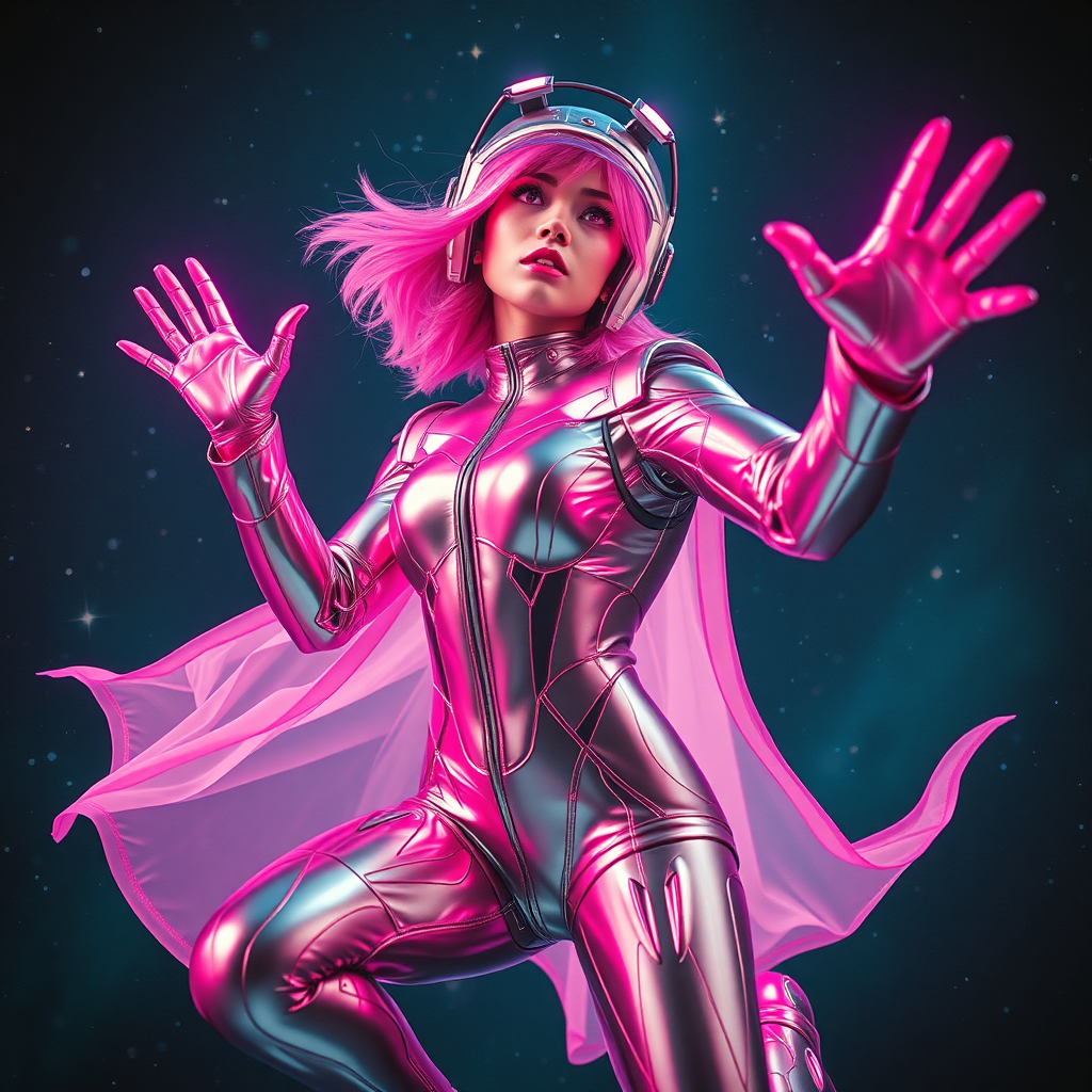 A high-resolution image captures the essence of a dynamic character in a futuristic setting—a shining AI with an almost human face. She's clad in a sleek metal suit and helmet, poised energetically in a leaping pose with flowing garments suggesting motion. The vivid color scheme blends vibrant pinks with reflective silvers, exuding a nightcore aesthetic. Dramatic backlighting creates a neon glow that contrasts with the darker cosmic backdrop, highlighting her brightness. The depth of field and clarity focus sharply on her, with a blurred background enhancing the cinematic feel. Realistic textures adorn her clothing and hair, while a visible light source in her hands emits a gleaming, otherworldly effect. Her purple eyes gaze upwards, and she reaches out energetically, capturing a candid, spontaneous moment in a surreal sci-fi universe. Shot with the cinematic touch of a GoPro HERO10 Black and the vibrant hues of Cinestill 800T, this cyberpunk scene conveys a captivating blend of action and fantasy in a futuristic world.