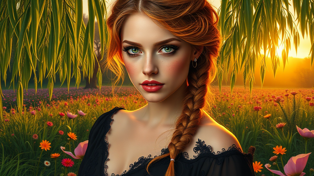 Detailed face with sensual features, messy ginger hair adorned with freckles, showcasing strong features and a square jaw. The hair is styled in long intricate braids accentuating high cheekbones and sharp features. Heart-shaped lips accompany her alluring look, while a long dark elegant sensual dress complements her hourglass figure and large chest. Her green eyes sparkle under dynamic golden hour lighting, creating a beautiful and colorful landscape around her. Surrounded by weeping willows, green grass, and an array of flowers, the scene is an earth-inspired art piece detailed in a colorful, fantasy matte background. The painting exhibits intricate elegance with highly detailed oil strokes. With artistic influences from Artgerm, Greg Rutkowski, Alphonse Mucha, and William-Adolphe Bouguereau, it reflects hyper-realistic elements and smooth, sharp focus illustration, akin to concept art found on ArtStation. The character stands in a zoomed-out view, capturing her full body in stunning UHD, HDR, and 8K resolution. Flaws are absent with no sign of disfiguration or deformities. There are no duplicated or mutated features, maintaining a high-quality photorealistic impression free from distractions like low resolution, out-of-frame elements, or digital artifacts.