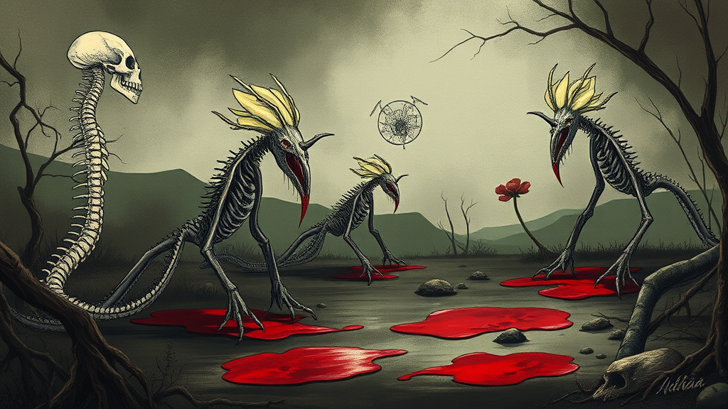 Venus flytrap-inspired creatures of bone-eating monsters in a moody landscape; sketch of intricate skeletal structures, emphasizing spine, ribs, joints, and bones merging with stylized elements; storybook illustration featuring capillary-like graphics; eerie lighting casts shadows across a scene where crimson liquid pools in thick red puddles; surreal and atmospheric design invokes a fusion of nature with haunting elements.