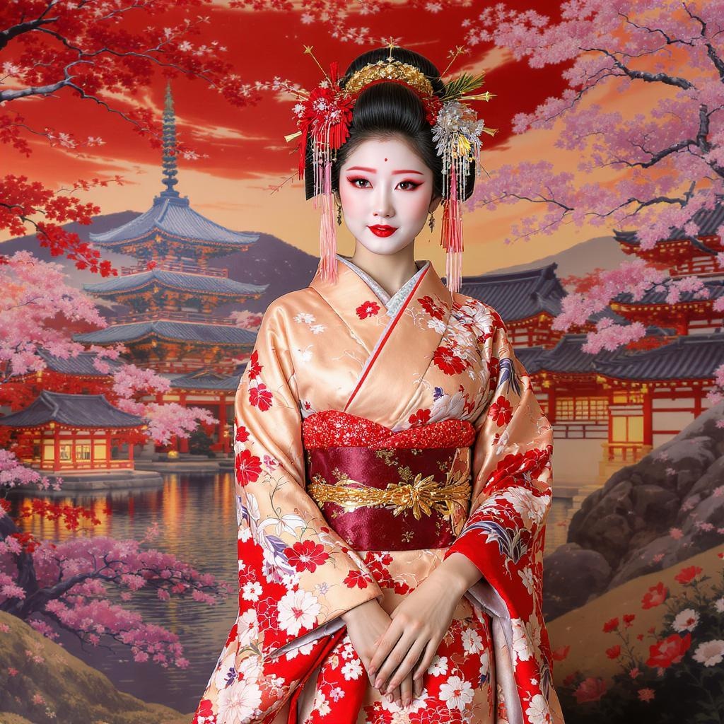 Masterpiece, high resolution, stunning, silk kimono adorned with an intricate red and white floral pattern, lustrous red kimono belt highlighted by a golden cord, woman elegantly dressed in the exquisite kimono, styled with traditional geisha hair, picturesque Kyoto scenery in the background, exuding glamor, elaborate and glossy backdrop, engaging the viewer with a captivating pose, curvaceous figure.