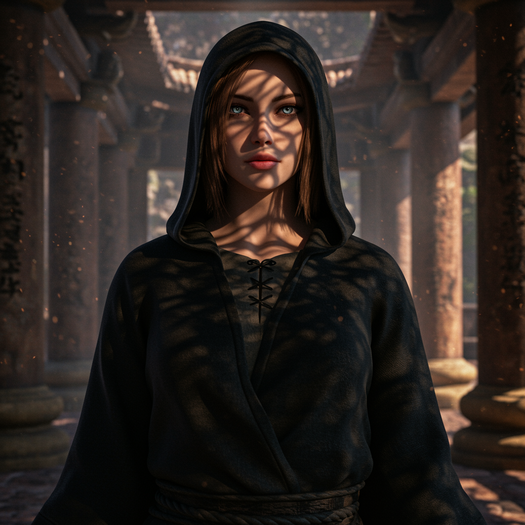 A young woman in dark robes stands in a temple setting, her symmetrical eyes catching the dramatic lighting that casts intricate shadows across her face. The scene is captured in hyperrealistic detail, with a sharp focus on the elaborate textures and the realistic play of light and shadow. The composition features a dynamic pose, showcasing a blend of photographic realism and digital artistry. The atmosphere is enhanced by a complex array of details rendered through advanced physics-based raytracing, bringing the scene to life in HD. The overall image combines elements of CGI and 3D digital painting, offering a unique fusion of cartoon, anime, and illustration styles, all wrapped in a hyperrealistic presentation.