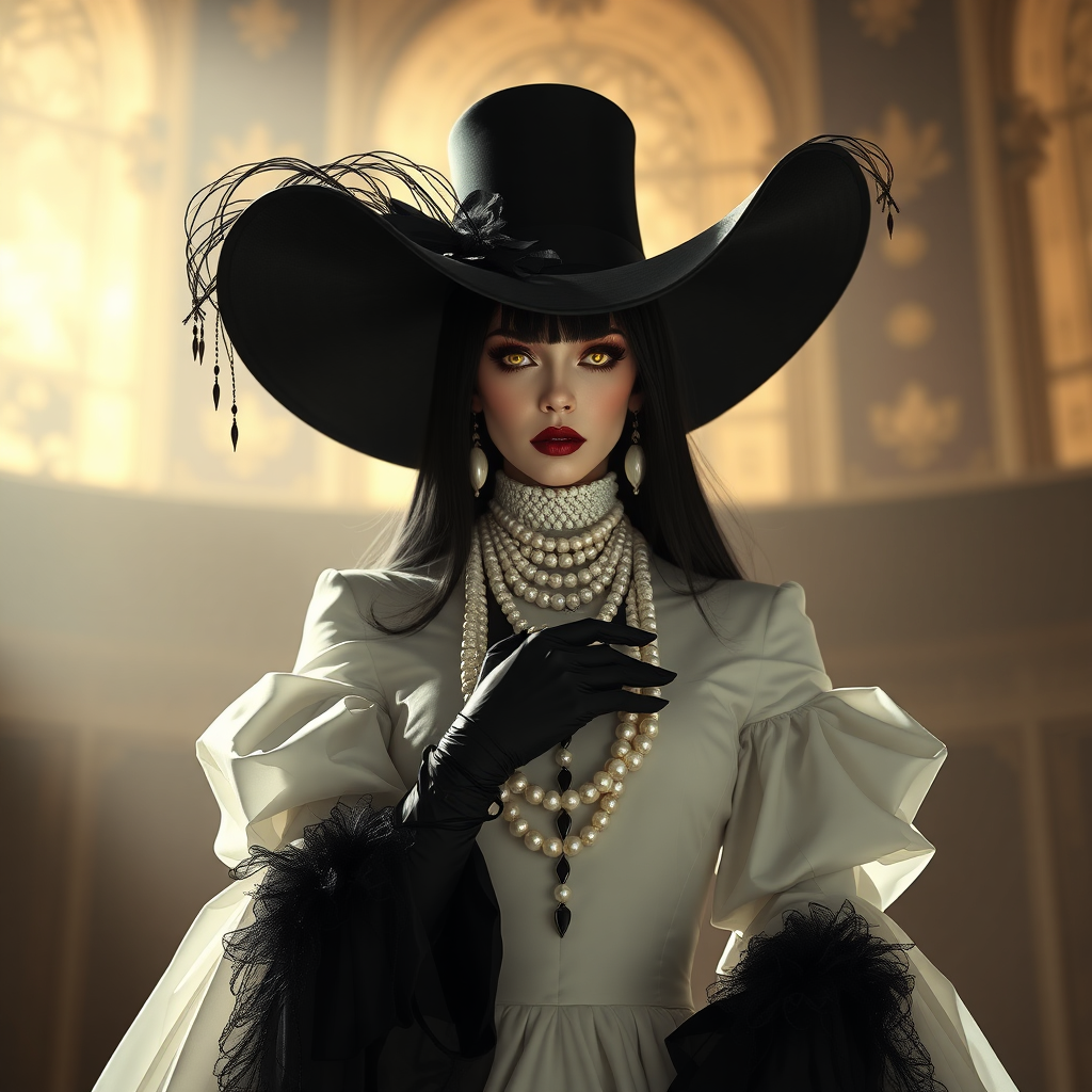 An extraordinary photoshoot of the villainess Alsina Dimitrescu, towering at nine feet with midnight black hair and piercing yellow eyes. Her alabaster skin contrasts with dark red lipstick, and she dons an incredibly long, flowing white gown complemented by elegant black gloves. A grand black wide-brimmed hat sits atop her head, while multiple strands of pearls adorn her neck. Evoking a dark fantasy ambiance with a Bathorycore aesthetic, this creation mirrors the style of the Resident Evil game series, merging tension and elegance with an anime-inspired expressive approach.