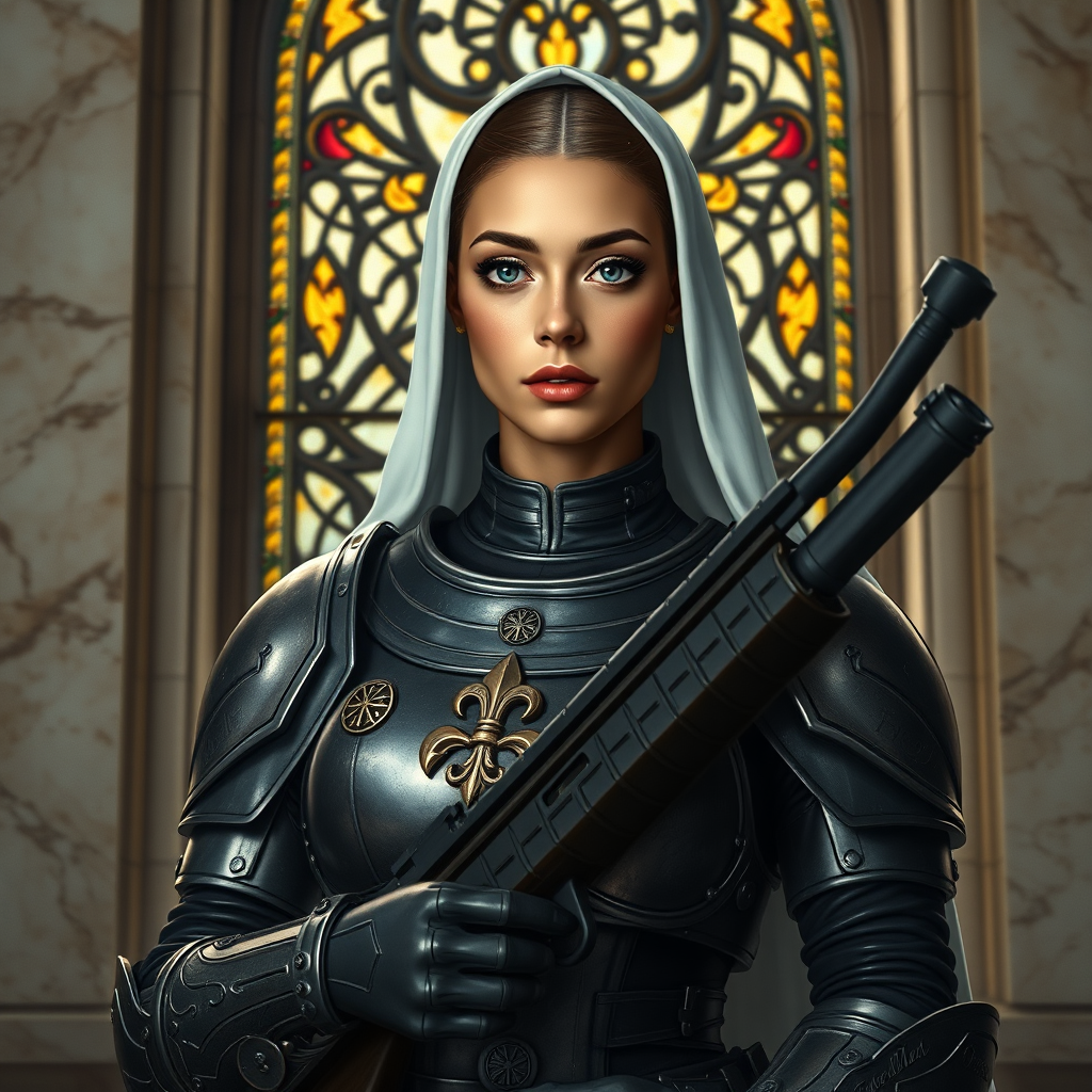 A full body portrait of an exceptionally beautiful woman, adorned as a sister of battle, holding a ceremonial bolt rifle, stands with grace before a grand stained glass window. Her skin exudes a warm tan, marked delicately by a fleur de lys tattoo on her face. Her armor is embellished with wax seals, conveying a sense of sacred duty, while her symmetrical features are striking in their precision. Her eyes reflect her environment, framed by dark, defined eyebrows and subtle makeup. She is encased in sci-fi armor reminiscent of a futuristic nun, a nod to the Warhammer 40k universe. Behind her, the marble walls capture the light elegantly, with dust particles accentuating the dramatic chiaroscuro lighting. The style is reminiscent of a professional impressionism oil painting by masters like Waterhouse and Constable, infused with the vibrant storytelling of Studio Ghibli and the majestic touches of contemporary artists such as Jeremy Mann and Greg Manchess. The setting carries an air of intricacy and high detail, echoing the works trending on ArtStation and CGSociety, with a nod to Makoto Shinkai's Kyoto aesthetic. The composition is a blend of classic elegance and modern sci-fi with dramatic and intricate details.