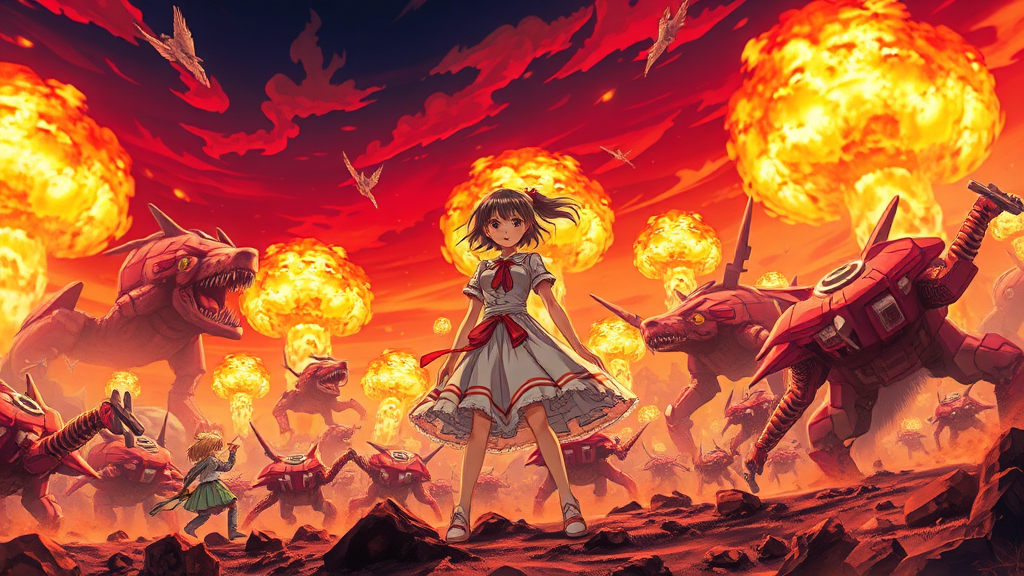 An awe-inspiring anime girl stands at the center of a dramatic scene, envisioned by the legendary creators Hideaki Anno, Katsuhiro Otomo, and Rumiko Takahashi. This movie poster captures the essence of a box office sensation and a storytelling masterpiece. Surrounding the powerful hero, monstrous and mechanical creatures clash in a fierce battle. The sky is alight with the fiery hues of nuclear explosions, casting an intense glow over the battlefield. This highly detailed 8k image showcases a vivid world full of dynamic action and emotion, celebrating artistic brilliance and epic narrative.