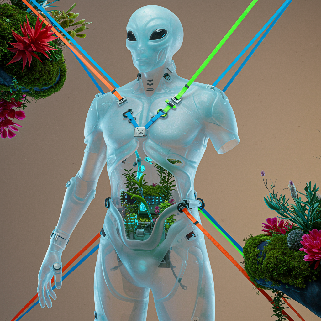 A futuristic photoshoot showcasing an advanced, alien full armor, suspended and displayed with vibrant, crisscrossing mooring straps that dominate the composition. The armor is crafted from translucent, frosted material with a matte finish, offering a smooth surface and soft, cloudy translucency that gently reveals the interior, although slightly blurred. Inside, bioluminescent plants and minimal electronic components emit soft hues of blue and purple, adding a harmonious fusion of biotechnological and organic elements. The armor's design is abstract and avant-garde, shifting away from traditional humanoid forms. It features elongated, flowing curves, irregular geometric patterns, and unexpected, organic joints, evoking an alien-like structure. The sleek exterior lacks a humanoid outline, suggesting a futuristic, imaginative design that's fluid and unconventional. The semi-translucent material provides a faint glimpse into the interior where plants and components are subtly blurred, enhancing the armor's ethereal presence. Suspended in mid-air, the armor is secured by vibrant mooring straps in electric blue, neon orange, and vivid green, contrasting sharply with the soft matte finish of the armor. These straps, securing the piece like a high-end art installation, create a striking juxtaposition between the sleek, futuristic design of the armor and the practical nature of the mooring system. The background is minimalist, featuring neutral tones and soft gradients, keeping the focus on the armor. Organic elements like moss, exotic plants, and alien-like flora in vibrant reds, magentas, and cyans subtly enhance the futuristic design. This juxtaposition adds a touch of nature and life to the otherwise clean and technological aesthetic. The camera angle is unconventional, extremely close to the armor, providing an in-depth view of its intricate details, the texture of the frosted material, and the crisscrossing mooring straps. The lighting is soft yet precise, creating gentle reflections on the armor's surface while emphasizing the glow of the plants, the minimalist structure, and the bold, bright straps. Captured in ultra-realistic, hyper-detailed 35mm photography style, the shot evokes the feel of a high-tech fashion magazine photoshoot, with every detail sharp and vivid, immersing the viewer in this futuristic display. Technology art magazine. Artsy composition.