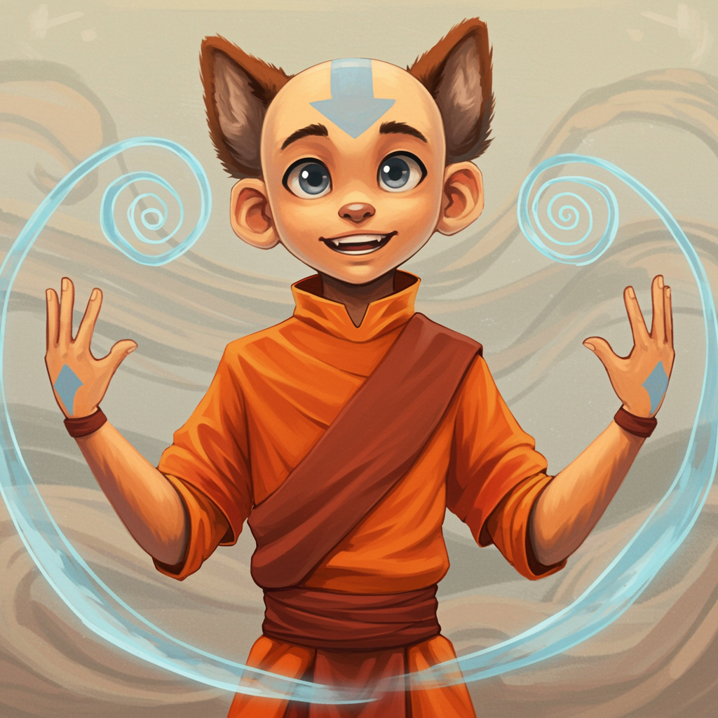 Young Avatar Aang, the last airbender, depicted in the unique style of furaffinity, wearing vibrant orange robes. His expression is playful yet wise, surrounded by swirling elements that hint at his airbending abilities. The background is a serene, abstract atmosphere that accentuates Aang's connection to the elemental world. His features capture a youthful innocence, with a hint of mystery and adventure. The color palette is rich, blending warm and cool tones that reflect his inner balance and harmony with nature.