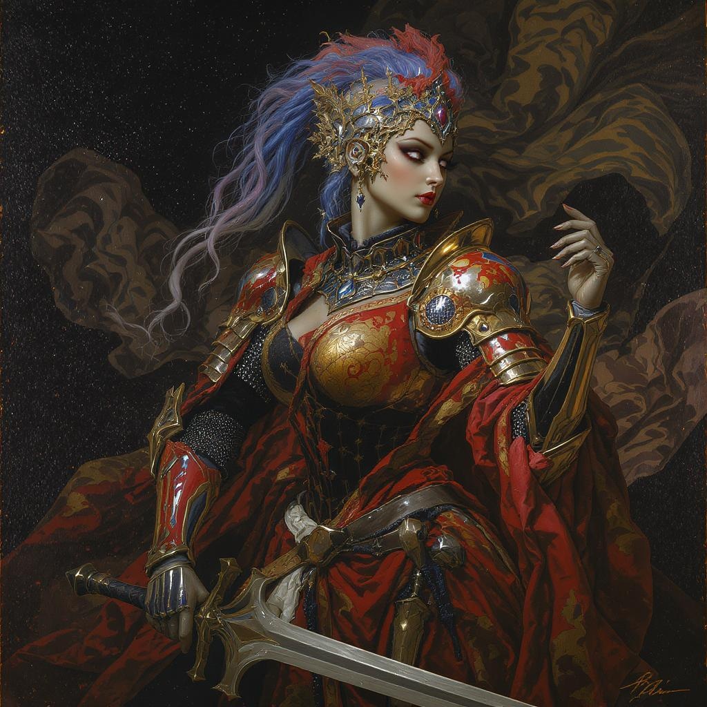 Modelshoot style, full shot of an exquisite artwork featuring a figure in medieval armor, inspired by a fusion of professional, majestic oil paintings by Ed Blinkey, Atey Ghailan, and Studio Ghibli. The piece is reminiscent of works by Jeremy Mann, Greg Manchess, and Antonio Moro, and is trending on ArtStation and CGSociety. It boasts intricate, high-detail, photorealistic qualities with sharp focus, emanating drama and artistry as if crafted by Midjourney and Greg Rutkowski. Incorporating elements of cartoon and 3D style, the artwork features vibrant, unconventional colors. The piece subtly plays with perception, showcasing unusual anatomy and proportions, including extra limbs and features, imparting a surreal, dream-like quality. The overall composition may intentionally blur boundaries between fantasy and reality, taking inspiration from video game aesthetics and abstract expressionism.