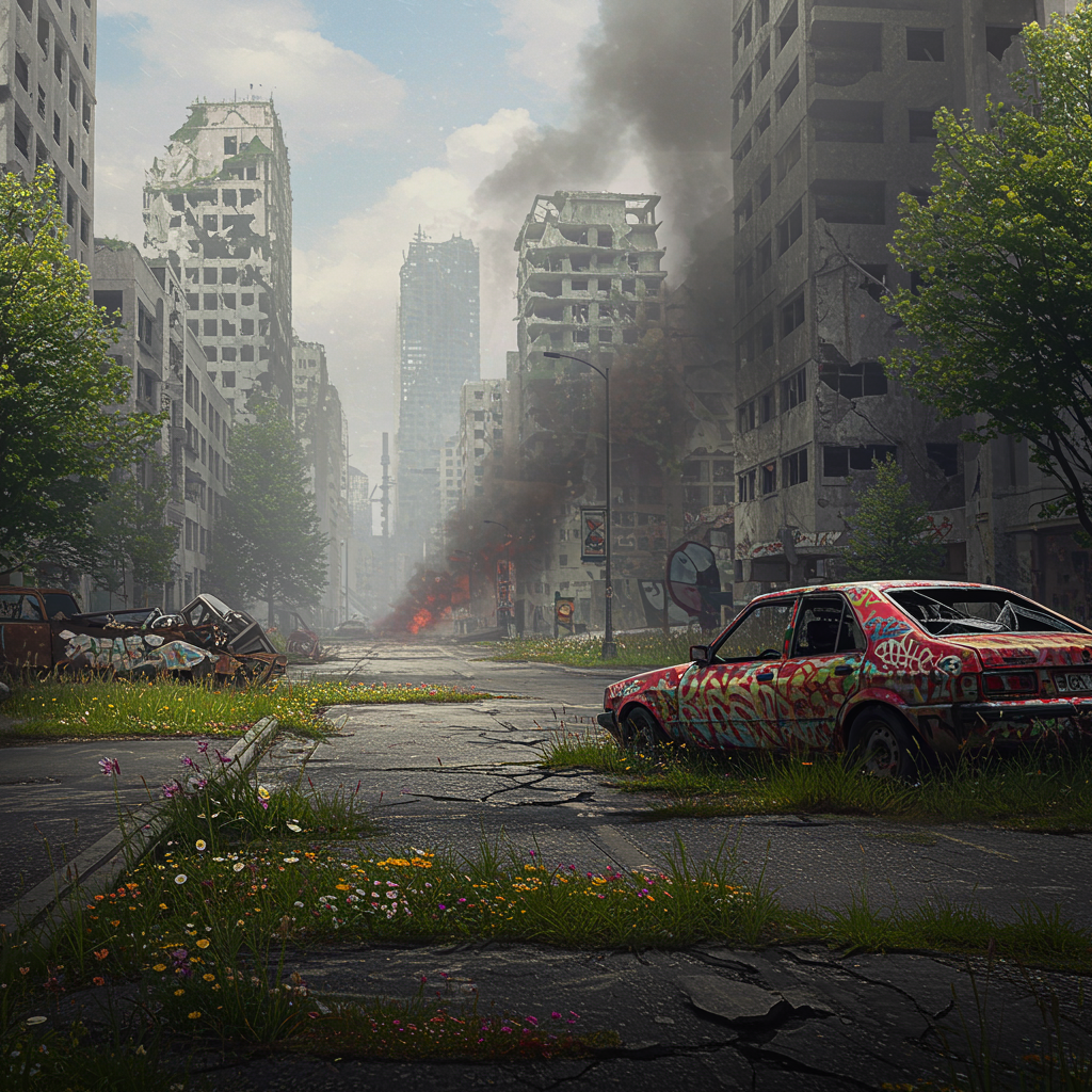 A gritty cityscape emerges from the ruins of a once-thriving metropolis, where the remnants of towering structures stand as jagged silhouettes against a smoky, overcast sky. The streets are deserted, save for a lone, battered car displaying a jumbled fusion of rust and bright graffiti, a stark contrast against the monochrome backdrop. Broken windows and crumbling facades mark the city's decline, yet wildflowers burst through cracked sidewalks in a vibrant rebellion against the desolation. The air is filled with the constant hum of a distant, unseen engine, its rhythmic pulse offering a hopeful promise of continuity amidst chaos. In this post-apocalyptic tableau, a subtle blend of muted colors weaves through the scene, hinting at life and resilience, creating a surreal atmosphere where optimism flickers like a candle in the gloom.