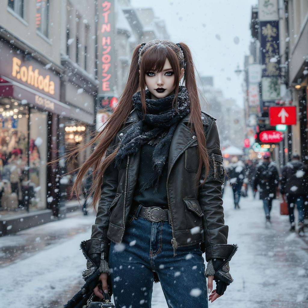 Cinematic shot of a gothic girl, centered and shot from below, striking a dynamic pose. The focus is on her captivating features: cold yet gorgeous, with a long chestnut ponytail. She is wearing a scarf, jeans, and a rugged leather army jacket. She's standing amid a snowy blizzard in a bustling shopping district on a city street. The RAW photo captures volumetric lighting and global illumination, with reflections and a soft bokeh effect in the background. The image is a professional-grade, highly realistic depiction rendered in 64K HD, resembling work inspired by Makoto Shinkai, using Unreal Engine and Octane Render.