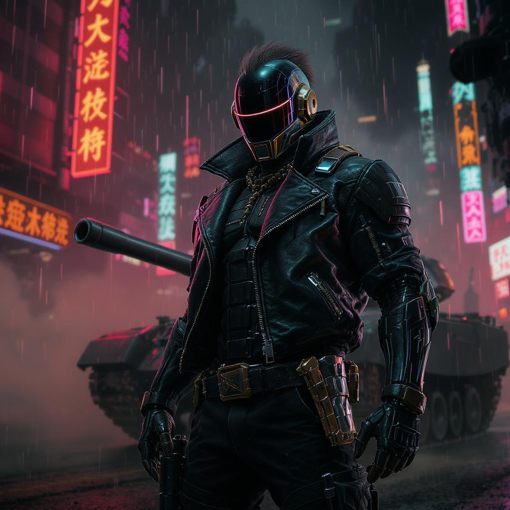 Masterpiece full-body shot intricate raw photography. Cyberpunk realistic highly detailed 3D rendering top quality masterpiece ultra-high-resolution. Cowboy-inspired scene, photorealistic raw photo official art, dynamic close-up, elaborate background, surreal atmospheric sinister vibe, futuristic tank in view, bold angle, advanced cyber helmet with mecha elements, robotic armor, mechanical limbs, sci-fi exo-suit, devoid of humans, rugged asymmetric attire. Tactical oversized black leather jacket, sleek black helmet with HUD, ultra-modern photorealistic style, Daft Punk-style cyber facade, black tactical gloves, black techwear cargo pants, avant-garde clothing, spiked hair, punk rebellion, punk-rock ethos, cinematic sci-fi narrative, synthwave aesthetics, nocturnal dark ambiance, intricate and futuristic design, razor-sharp crisp focus, fierce stance, cutting-edge weaponry, vivid hues, intense cyberpunk metropolis, neon street lights, Insta-worthy capture, Photo of the Year potential, cinema4d artistry, dramatic lighting interplay, realistic visual effects, advanced Octane render, supreme photorealistic quality.