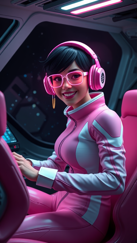 A 3D render of a female dark space explorer with very short black hair sitting in her cockpit, surrounded by futuristic controls. The vast darkness of space is visible through the windows. She wears a sleek pink and white sci-fi outfit and sits on a matching pink chair. A pink headset rests on her head, enhancing the glow of neon lights reflecting off her glasses. Despite the gravity of space, she smiles warmly, her face framed by the cockpit's ambient glow. Her hands rest on the controls, fingers deftly guiding her ship. The scene is filled with high-tech details, emphasizing the advanced technology of the cockpit. Her confident pose and expression highlight her expertise and adventurous spirit, ensuring her oneness with the ship and the vast universe she explores.