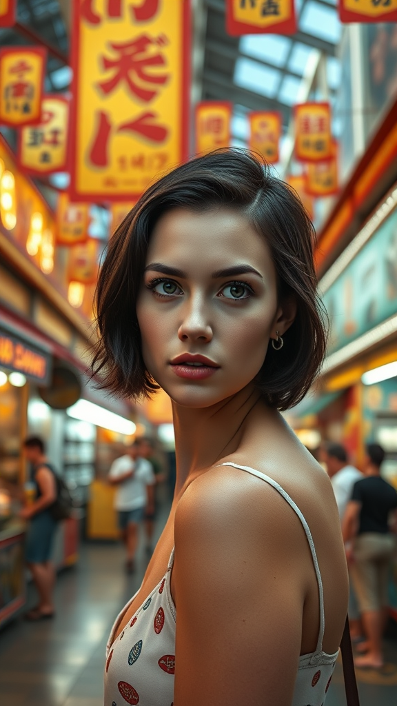 Photo of a stunning Daisy Ridley at a lively amusement park, gazing directly at the camera with her short dark hair, amidst bustling merchant stalls offering a variety of food and souvenirs. Bright, colorful banners stretch over the wide walkways, creating a festive atmosphere. The photograph is in sharp focus, showcasing professional portrait photography qualities with dramatic lighting reminiscent of works by WLOP, Jeffrey Simpson, Antonio J. Manzanedo, and Greg Rutkowski. The background is richly detailed with vibrant illustrations and drawings amidst the amusement park, while Daisy Ridley is depicted with expressive features, emphasizing her intense and captivating presence. The scene captures a dynamic depth of field, portraying multiple angles and perspectives, all in color with intricate shading. The image is polished and stylized, maintaining high quality and attention to detail, focusing on a polished portrayal without distractions from low-quality elements or artifacts.