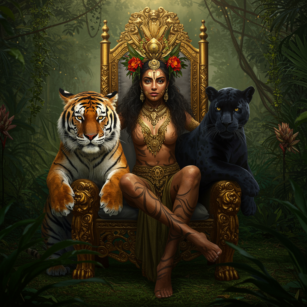 Gorgeous pi goddess with a majestic tiger and sleek panther, intricately detailed face, seated on an ornate jungle throne amidst a verdant and lush environment, bathed in cinematic lighting, embodying junglecore essence, character portrait styled by Annie Leibovitz, meticulously retouched by Pratik Naik, aura enhanced by ethereal glow, adding subtle golden accents in the surroundings while maintaining a mystically regal atmosphere.
