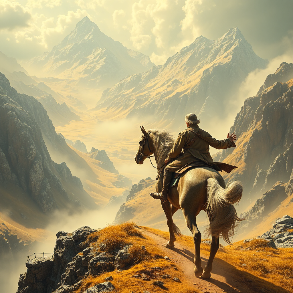 A horse rider traverses an epic landscape, depicted in the style of cinematic montages. The scene is imbued with the mythical essence of dragon art, reminiscent of Franciszek Starowieyski's fantastical visions. Dominated by hues of yellow and white, this masterpiece channels the meticulous, hyper-realistic detail akin to John Howe's work. Inspired by the intricate beauty of Himalayan art, the composition blends the sublime with the surreal, capturing the grandeur of an otherworldly journey.