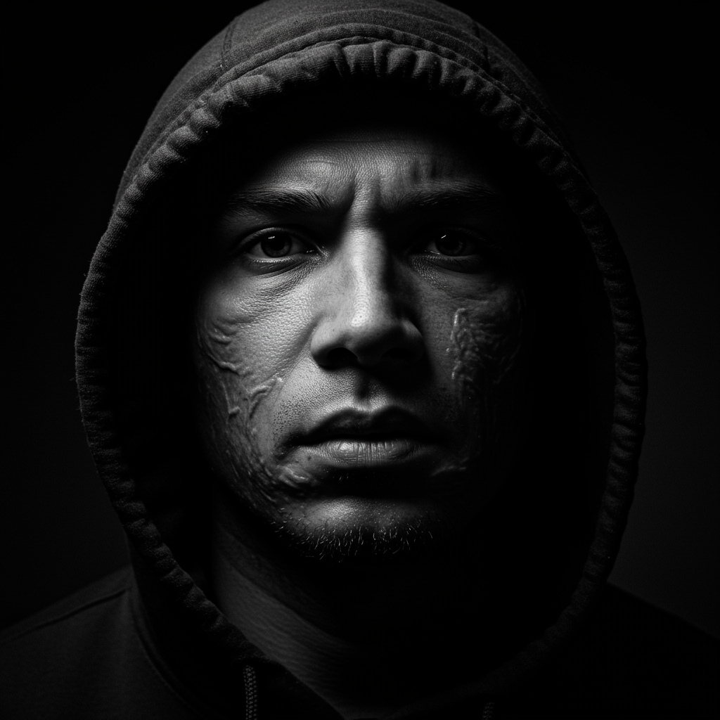A man with facial scars, donning a hoodie and wearing a serious expression, is captured in a dark room. He is backlit, with a close-up portrait photograph rendered in black and white. The image has high contrast and a grainy texture, reminiscent of a Leica M6 film camera shot using an f/2 lens for pronounced depth of field. The eyes are in sharp focus, and shadow play accentuates his facial contours. The hood casts a soft, airbrushed effect over his face, styled elegantly in portrait photography tradition.