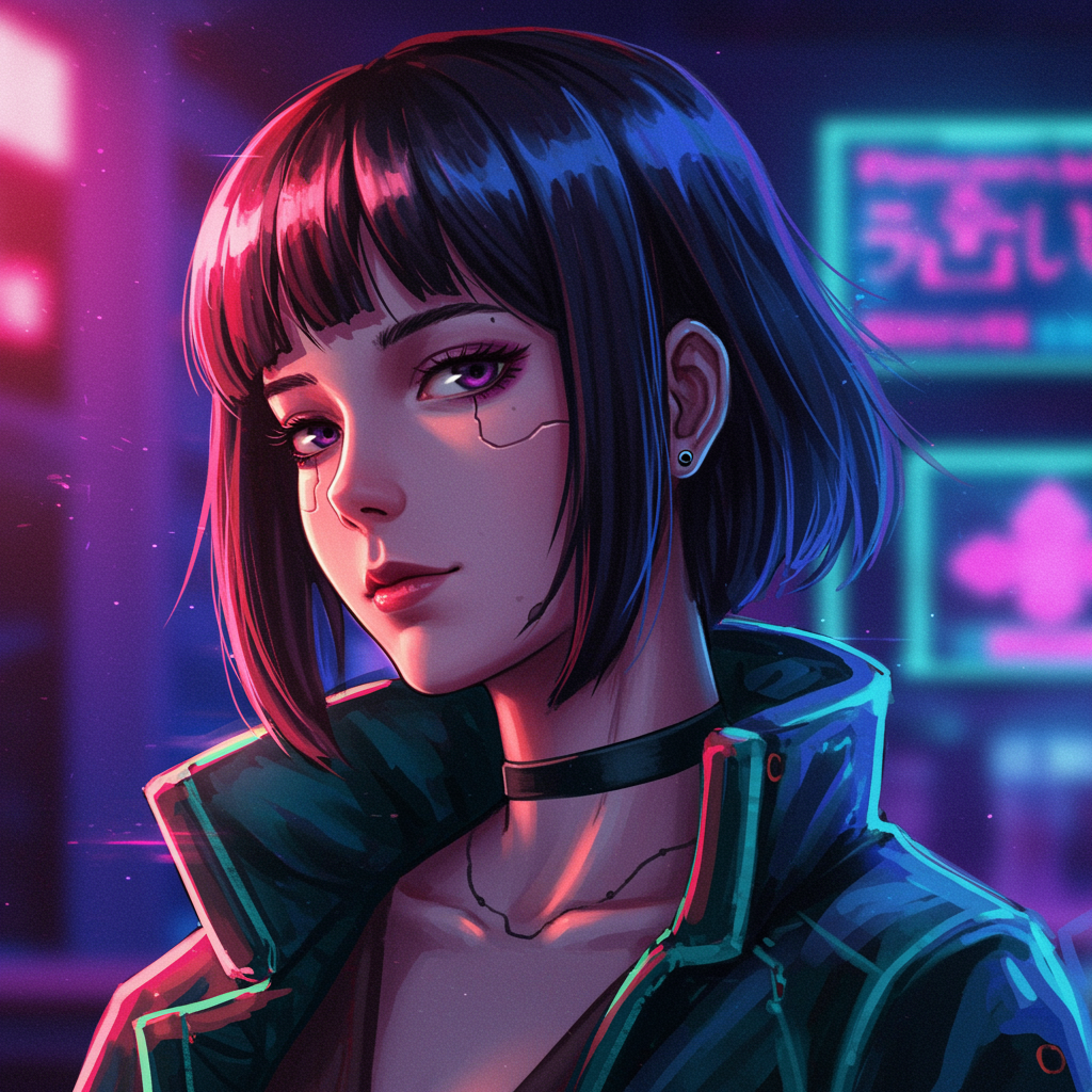 portrait of an anime character inspired by Ghibli and Akihiko Yoshida styles, depicting a woman in a cyberpunk and synthwave setting, with sci-fi elements and soft lighting. The character should have finely detailed features, exuding a sense of perfect art with high elegance. The image includes themes of low resolution with minimal imperfections such as slight text errors and potential for missing or extra digits. The composition is subtly cropped with a focus on avoiding poor quality elements. Aim for a balance of artistic details without being overly polished, infusing a sense of mystery and allure.