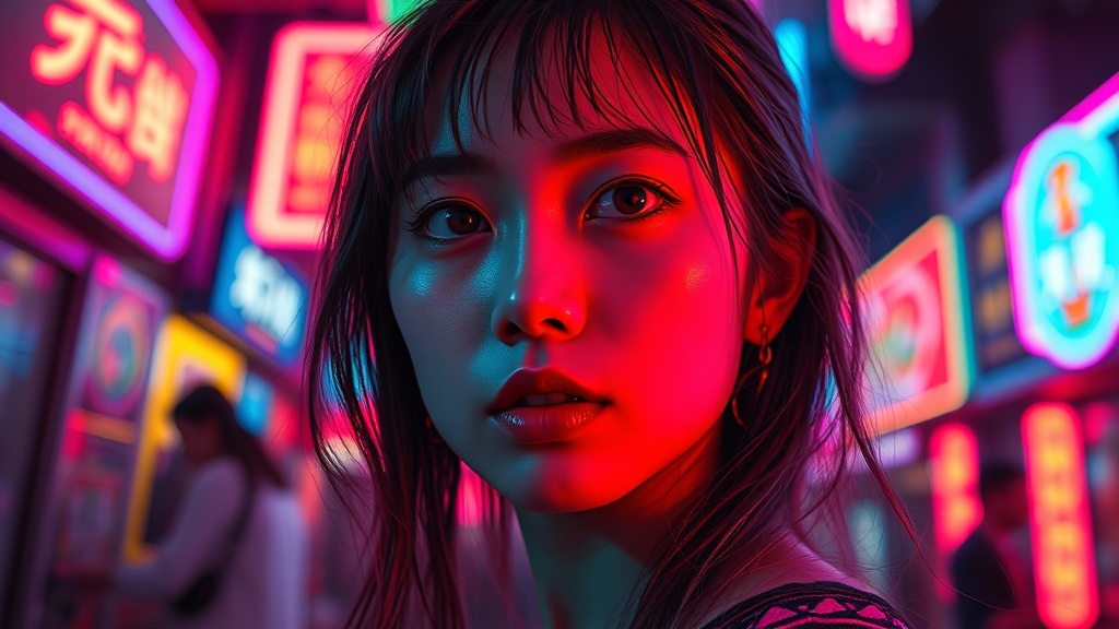 Full length image of a woman illuminated by vibrant neon lights against a bright backdrop, showcasing vray tracing style with stylized portraiture, featuring layered lines and Asian-inspired elements. The image is hyper-realistic with intricate details, highlighting intense close-ups and contrasting shadows. It embodies the essence of neon art nouveau, combined with hyper-realistic sci-fi and pop art brightness. Featuring silhouette figures, the composition is infused with light cyan and light crimson hues, reminiscent of Paul Corfield's artistry. The visual is enriched with complex layers and textures, capturing the essence of Fujifilm X-T4 and Sony FE 85mm f/1.4 GM photography, emphasizing a raw style with heightened vividness and a unique blend of creativity within the core theme.