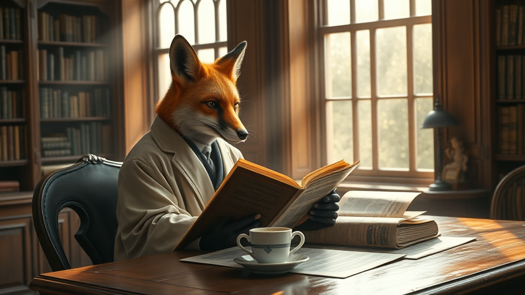A refined anthropomorphic fox sits gracefully at a wooden table, absorbed in an old book. Dressed in an elegant robe, it occasionally glances at the newspaper spread beside a steaming cup of morning coffee. The setting is a cozy, dusty library, where sunbeams filter through tall, narrow windows, painting a picture of serene late morning tranquility. The fox's cinematic attire and the richly detailed environment create an image that blurs the line between reality and imagination, capturing a moment of peaceful solitude.