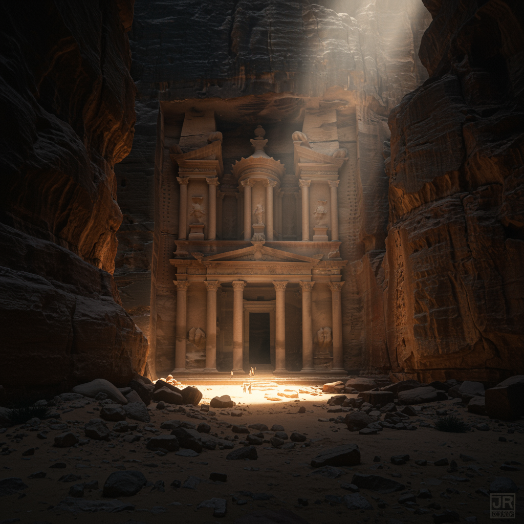 A majestic Sumerian temple lay in ruins, nestled within the canyon wall, its entrance surrounded by scattered debris. The setting is a vast desert landscape, with a dark canyon illuminated by striking rays of sunlight streaming from above. The scene evokes the grandeur of Petra, with cinematic storytelling and rich volumetric lighting. The imagery is incredibly detailed, with a focus on 16k resolution to ensure UHD and HDR quality. The temple's weathered stones tell tales of ancient times, as the play of light and shadows hints at hidden mysteries within. The atmosphere is serene yet filled with an air of adventure, inviting exploration and discovery. The composition captures an awe-inspiring blend of nature and human history, untouched by imperfections or distractions.