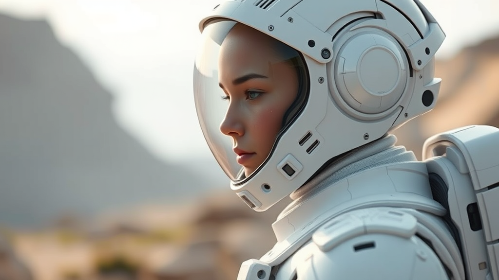 Futuristic white sci-fi female armor with intricate cybernetic helmet, complete with insulated spacesuit featuring exquisite fine details, evoking a sci-fi movie aesthetic. Captured outdoors in natural light, this photorealistic image boasts cinematic rendering and advanced ray tracing, showcasing the armor's texture and material at the highest quality and detail. The scene is depicted from a third-person perspective, employing blur effect and long exposure for dynamic motion, set in an ultra-HD 8K resolution. The intriguing moody and cinematic lighting enhances the atmospheric ambiance of the outdoor setting while highlighting the helmet and the bald head, maintaining the essence of an alien yet human-inspired design.