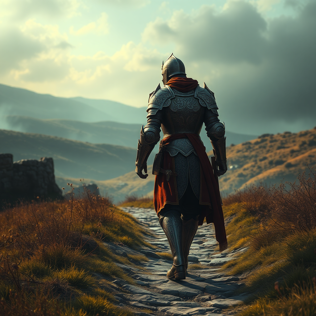A valiant wandering knight traverses a mystical medieval landscape, clad in full, intricately detailed armor that gleams under dramatic, cinematic lighting. The ambiance evokes the rich atmosphere of a medieval fantasy world, where each step resonates with the clink of metal. This solitary hero, a stalwart figure on an epic quest, is portrayed with masterful digital artistry, capturing the essence of an RPG adventure. Instead of a horse, the knight strides confidently on foot, a symbol of perseverance. The scene avoids duplications or malformations, highlighting a seamless depiction of the knight's noble form. The setting, alive with subtle enchantments, is rendered in high resolution, ensuring every detail, from the filigree on the armor to the distant, rolling hills, is a feast for the eyes, free from any digital artifacts.