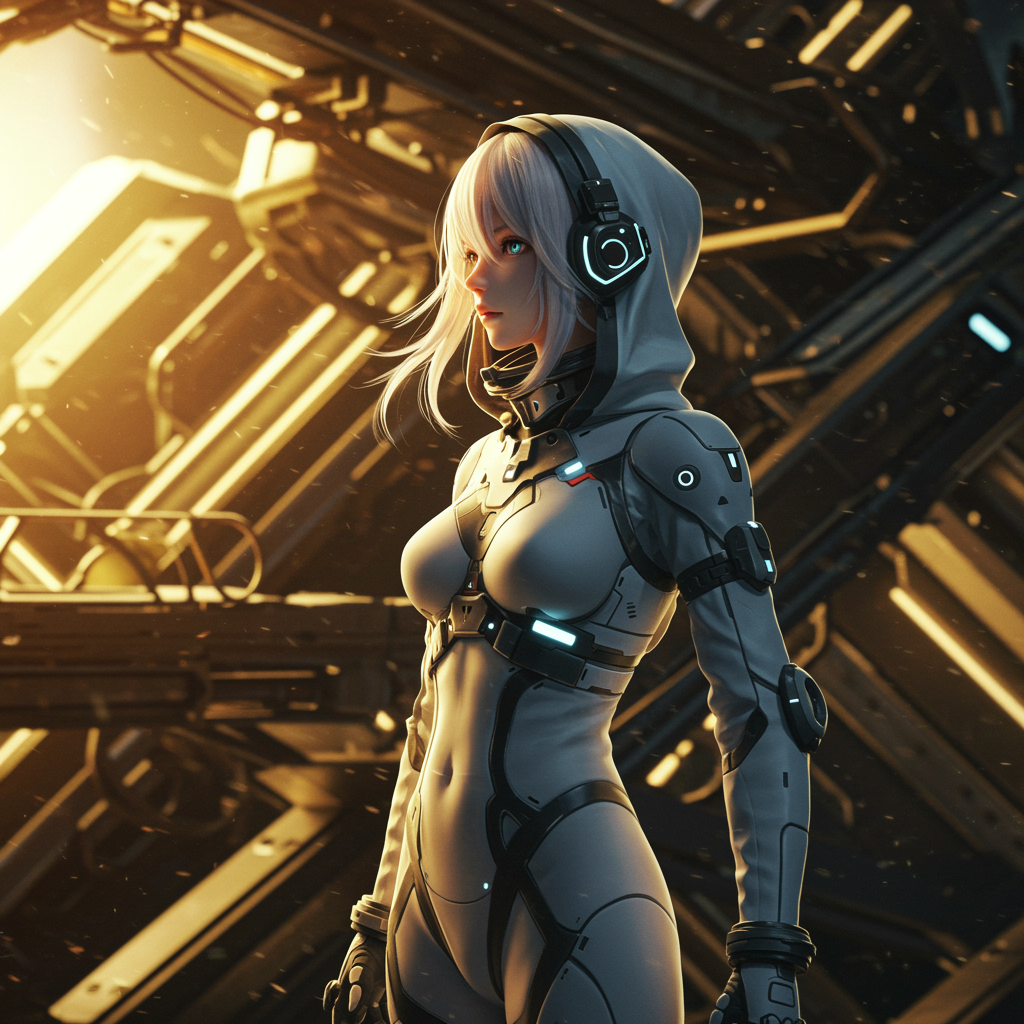 A breathtakingly beautiful girl in a sleek spacesuit stands in the background against the colossal, highly detailed framework of a sci-fi spaceship, reflecting the minimalist yet epic styles of Tsutomu Nihei and Sidonia no Kishi. The scene is illuminated by cinematic lighting that enhances her dynamically flowing hair. Her spacesuit features glowing elements at the chest with a helmet and piercing accents. She sports a hood and headphones, revealing a bare neck with a lithe and slender figure. The ambiance is doused in bright and blinding golden light, emphasizing the intricate rivets and symmetry of the scene. Unique futuristic elements blend seamlessly into the composition, avoiding any distortions or errors in proportion and anatomy, portraying a flawless, otherworldly allure.