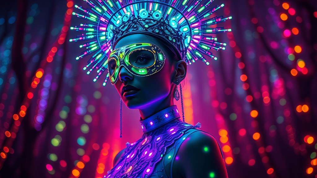 Long-shot, full-body portrait of a woman in a surreal, hyper-detailed cybercore universe, standing with an enigmatic gaze directed into the distance. Her skin gives way to bioluminescent, intricately glowing biomechanical formations, creating an otherworldly aura. She wears a mesmerizing headdress reminiscent of lavish marginalia, crafted with meticulous detail. A mask woven from fiber-optics covers part of her face, casting vibrant neon glows in shades of blue, green, and purple. Her ensemble radiates a kaleidoscope of colors, each hue shimmering with its own light. The backdrop is a glowing forest, a vivid neon wonderland that beckons with dreamlike allure, where fine particles dance among the rich color palette. The composition employs the rule of thirds and golden ratio, ensuring visual harmony. Achieved with photorealism, raytraced shadows, and a dynamic depth of field, the scene follows an asymmetric composition embodying hypermaximalist principles. Every detail is rendered with insane precision, utilizing octane render and unreal engine technology for a cinematic, 8k-ready photorealistic effect. The environment radiates an atmosphere of organized chaos, inviting viewers to explore its dazzling intricacies.