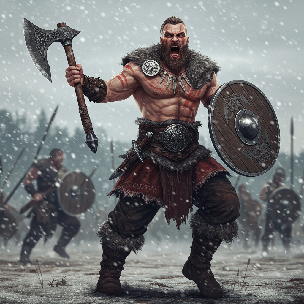 Fierce male barbarian with battle-axe, charging into battle with a powerful battle-cry taunt, showcasing hyper-detail and intense facial expression. The handcrafted cloth outfit is adorned with intricate war paint designs. Set against a battlefield backdrop with gentle snowfall, the scene features dramatic cinematic lighting. Rendered in concept art style using Unreal Engine 5 with RTX and ray tracing for photorealism. The warrior remains completely armed for battle, with every limb intact, embodying strength and readiness. Subtle creative elements enhance his ferocity, capturing the raw energy of the moment.