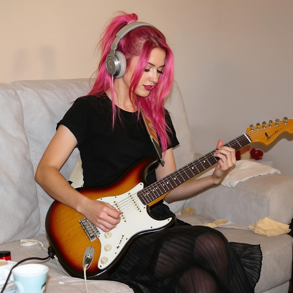 A young woman with striking pink hair plays an electric guitar indoors. She has long hair styled with one side up and captivating blue eyes. Wearing a pleated black skirt and a black shirt, she holds a plectrum in one hand as she strums the strings of her guitar. A pair of headphones rests comfortably over her ears, capturing the essence of her musical world. The scene captures a solo moment of musical expression, full of energy and creativity.