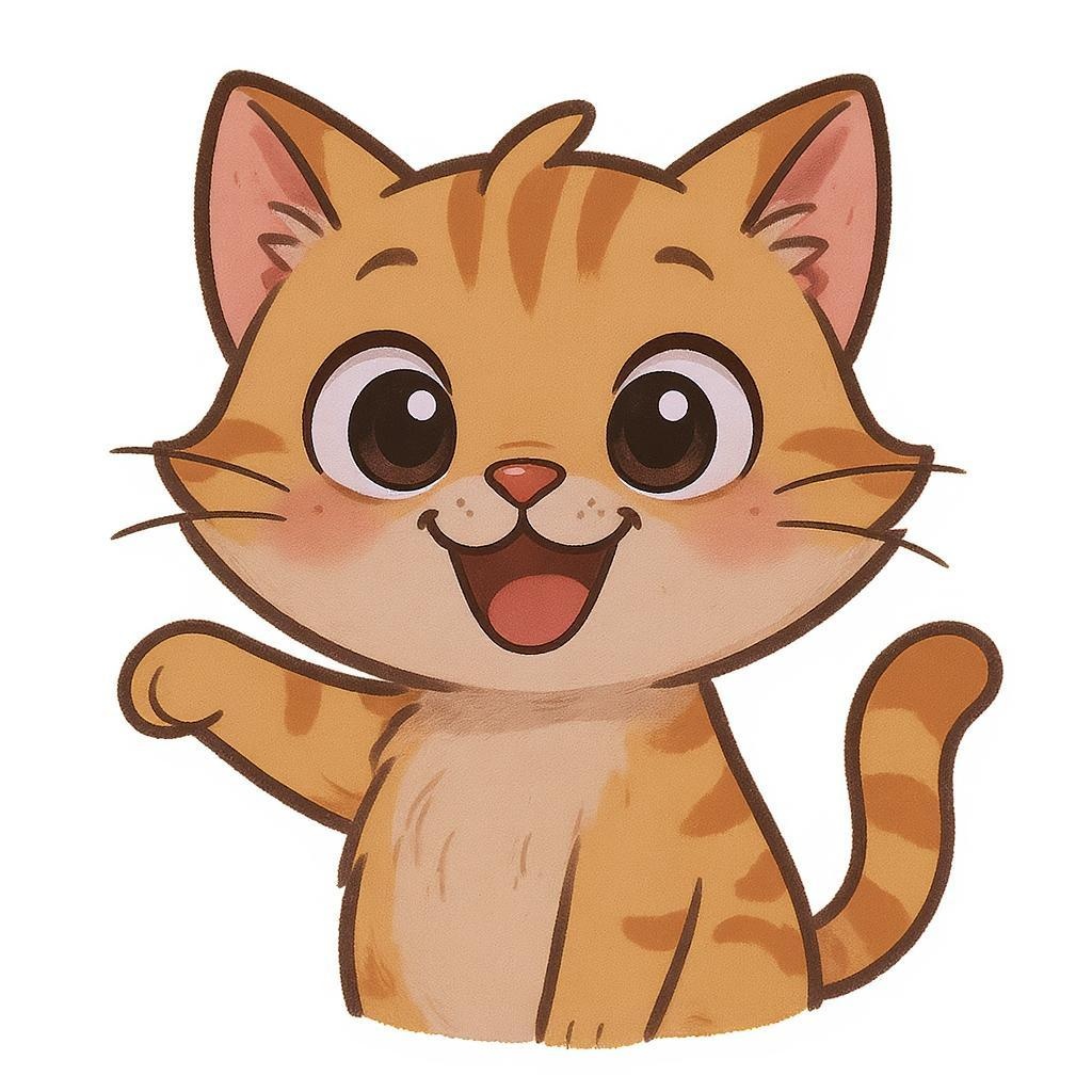 Adorable cartoon cat joyfully posing for a picture, its big eyes sparkling with mischief.