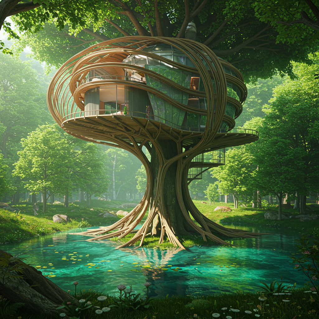 A breathtaking futuristic treehouse crafted by a visionary German architect sits gracefully atop a majestic tree, its roots disappearing into crystal-clear waters amidst a vibrant, emerald-green forest. The design is a marvel of hyper-realistic organic minimalism, featuring intricate details that capture the essence of nature's beauty. The structure blends seamlessly with its surroundings, echoing the artistic styles of Filip Hodas and Bo Bartlett, and comes to life in stunning 8K ultra-high-definition, surrounded by lush greenery that whispers stories of serenity and wonder.