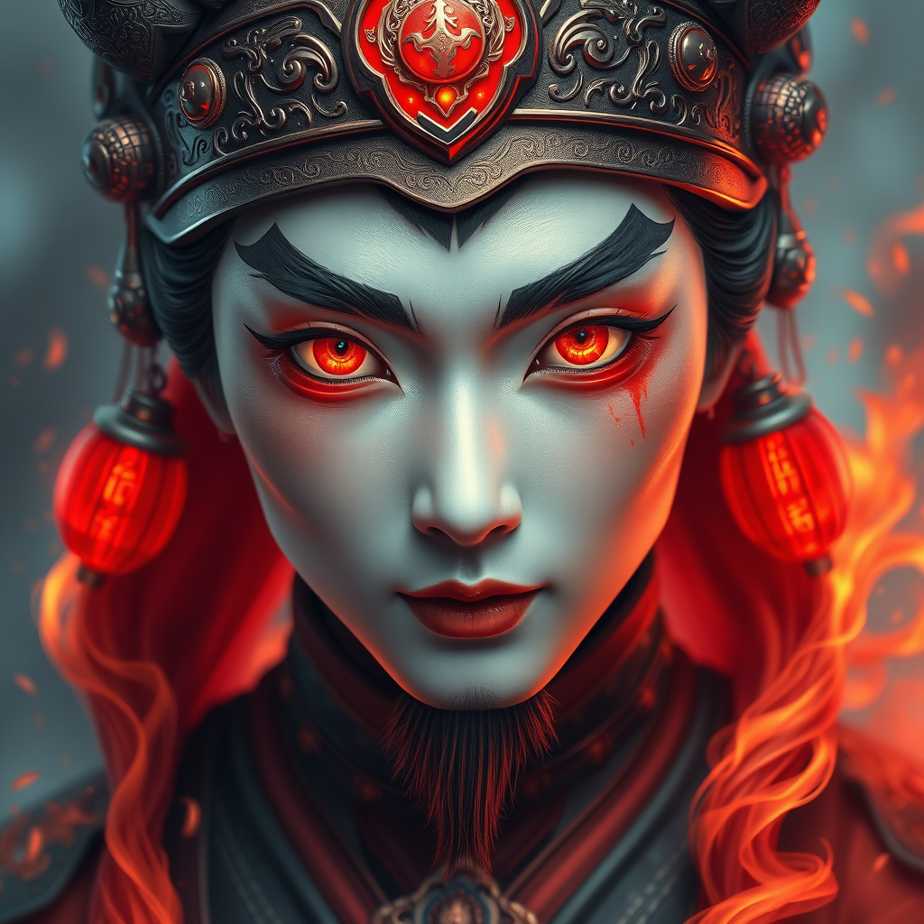 A Chinese character in a fiery costume with intense red eyes, presented in the style of a realistic, hyper-detailed portrait. The character is adorned in dark bronze and light blue hues, featuring digital airbrushing that evokes fantastical and otherworldly visions. The intricate details highlight luminous 3D objects that accentuate the character's presence. The artwork emphasizes realism despite abstract elements, avoiding any visual confusion or distortion. The composition ensures anatomical accuracy, focusing on defined features and clear expressions to enhance the striking, imaginative aesthetic. The scene is framed with clarity, free of distortions or artifacts, maintaining a captivating, dreamlike yet precise portrayal.