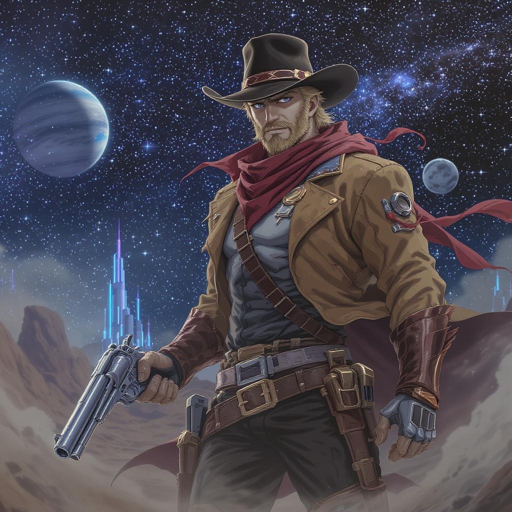 John Wayne as a rugged anime space cowboy, blending the gritty charm of a Wild West outlaw with the sleek tech of a sci-fi future, wandering the cosmos with a trusty plasma revolver in a vast, starry frontier. His attire combines classic cowboy elements like a wide-brimmed hat and leather boots with futuristic armor and gadgets, embodying the spirit of an intergalactic lone ranger. The dusty trails of otherworldly planets echo with his legendary presence, as he navigates lawless space towns, encountering eccentric characters and dangerous adventures, all set against a backdrop of neon-lit space ports and endless starlit skies.