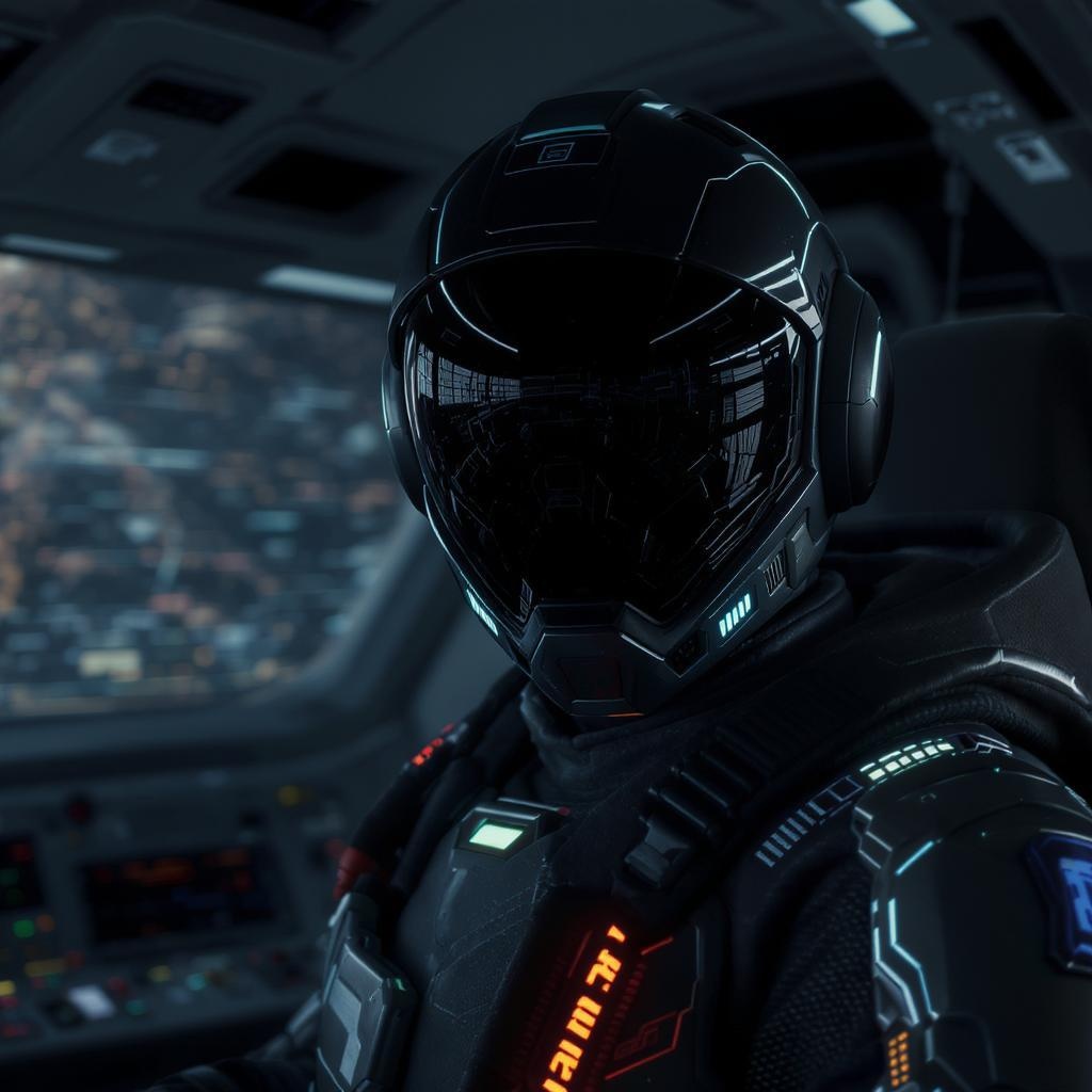 A hyperrealistic and intricately detailed portrait of a pilot wearing a futuristic helmet that entirely conceals the face, sitting comfortably in an advanced, sci-fi cockpit. The pilot is adorned in cyberpunk-inspired armor that glows subtly with bioluminescent patterns. The subject is gazing directly at the viewer, providing an intense and engaging connection. The scene is centered and captures a cinematic essence with sharp focus and a well-defined depth of field, enhanced by dramatic, moody lighting that accentuates the contours of the helmet and armor, further immersing the viewer into this futuristic world.