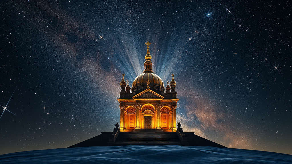 A celestial temple adorned with a myriad of shimmering stars, forming intricate patterns across the vast expanse of the universe βar 9:16, evoking a sense of cosmic wonder and timeless serenity.