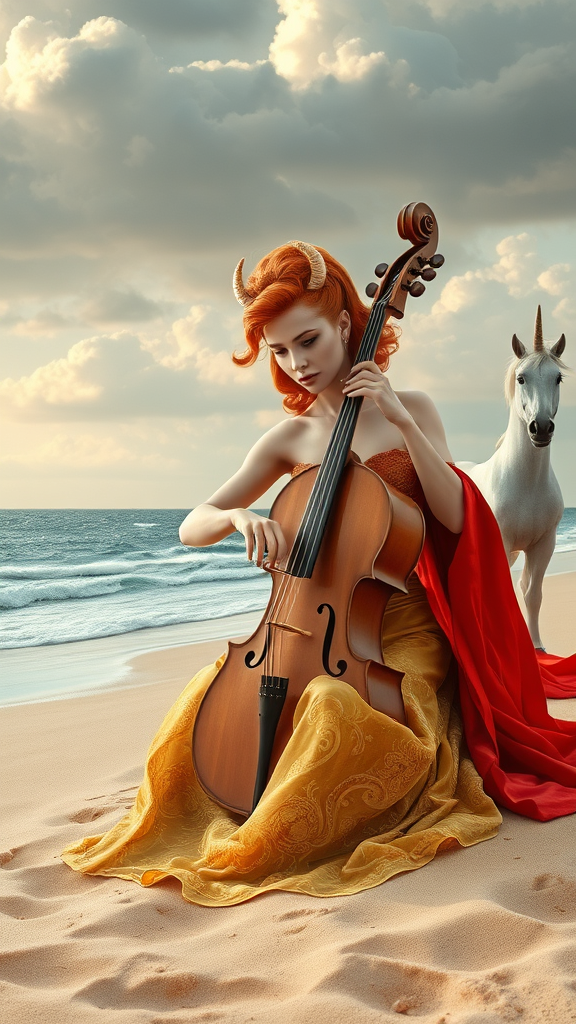 On a surreal beach landscape, where reality meets dreamscapes, a female figure with delicate features sits gracefully on the sandy shore, passionately playing a large, intricately carved cello. Her complexion is pale, accentuating her sharp, refined facial features and striking eyes that shimmer with a hint of curiosity. Her vibrant orange hair flows in whimsical curls, sculpted into a decorative horn-like shape atop her head, embellished with gold. She dons a luxurious golden gown adorned with elaborate patterns, swirling with the golden sand, and is dramatically accentuated by a flowing red cloak. The cloak, like liquid flame, billows around her as she plays, merging seamlessly with her surroundings. In the background, the ocean sparkles under a moody sky filled with fluffy pastel clouds, hinting at an impending weather shift. To the right, a mythical white unicorn stands serenely on the shore, its gaze fixed on the ocean’s horizon, weaving a touch of fantasy into the scene. The atmosphere is dreamlike; the air is filled with the gentle sound of music and soft waves lapping at the shoreline. The scene is painted in vivid, surreal colors, combining the artistry of Michael Cheval, Michael Whelan, and the surrealism of Dali with the impressionistic tones of Renoir. The image is presented with unmatched quality – ultra-real, crisp, and radiant with diffuse lighting, ambient occlusion, and masterful 3D texture and shading. Soft glows and light reflections dance harmoniously over the scene, enhanced by volumetric lighting, achieving a mesmerizing ultra-3-dimensional effect. The artistic excellence is captured with pencil-sharp edges and rich textures, crafting a masterpiece of high-quality AI art that pulses with life and imagination.