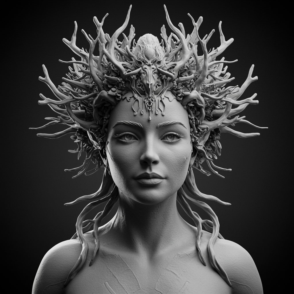 Hyper-realistic sci-fi sculpture of a woman in monochrome, adorned with an intricate crown that merges futuristic technology with organic elements. The crown intricately detailed with circuits flowing seamlessly into delicate branches and leaves, symbolizing a fusion of nature and technology. Smooth, realistic facial features convey serene wisdom, while her eyes, slightly larger than life, hint at an advanced, otherworldly intelligence. Subtle textures across her skin resemble both metallic and organic patterns, enhancing the surreal elegance of the piece.