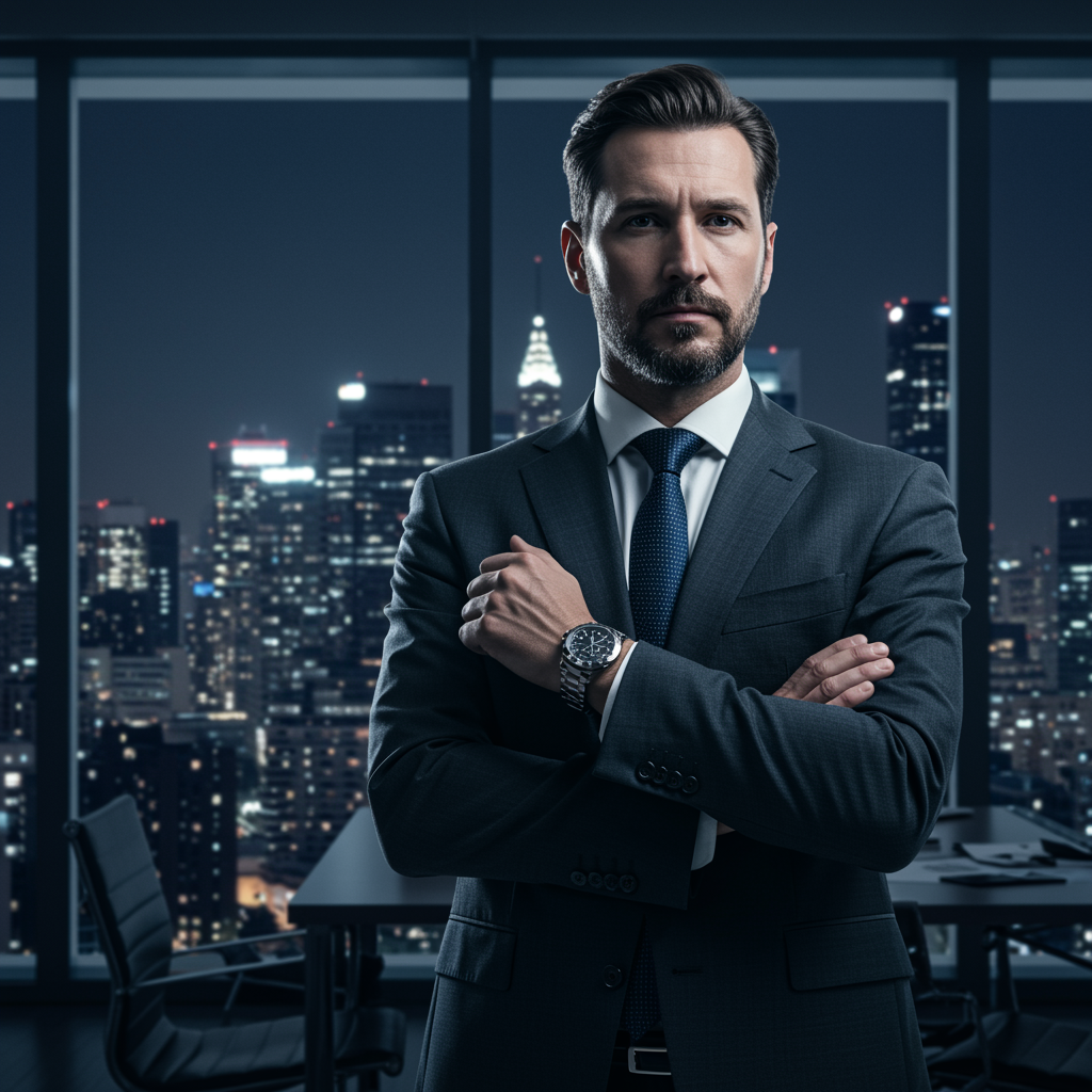 A sophisticated businessman with an iron-willed determination, standing confidently in a high-rise office, the skyline visible through the large windows behind him. The room is softly illuminated by the dramatic interplay of city lights and shadows, highlighting his meticulously tailored suit and a face etched with the wisdom of countless boardroom battles. His watch glints subtly under the dim light, a testament to his precision and attention to detail, while in his eyes gleams the innovative spirit of a man who balances the weight of corporate responsibilities with the genius of a visionary.