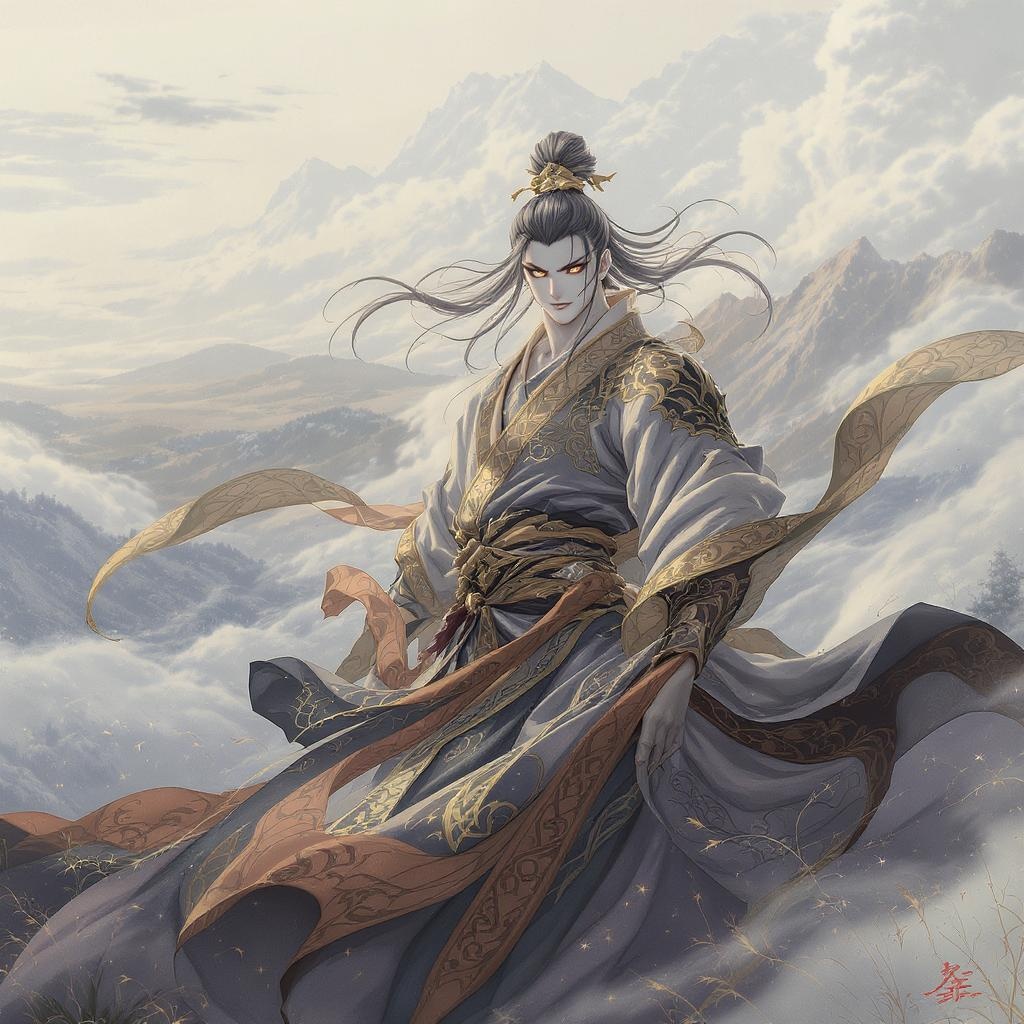 A majestic kung pow character emerges, designed with anime-inspired aesthetics, capturing the grandeur and detail reminiscent of Bernardo Strozzi's works. The character is adorned in a flowing robe that combines light navy and dark bronze hues, harmonizing with their serene, zen-inspired demeanor. Their stance exudes calm authority, akin to the classic illustrations of Ron Embleton, yet infused with meticulous realism. Subtle modifications include intricate patterns etched into the fabric, suggesting a rich martial arts heritage. The setting is a sprawling landscape, emphasizing the character’s presence yet offering a tranquil backdrop.