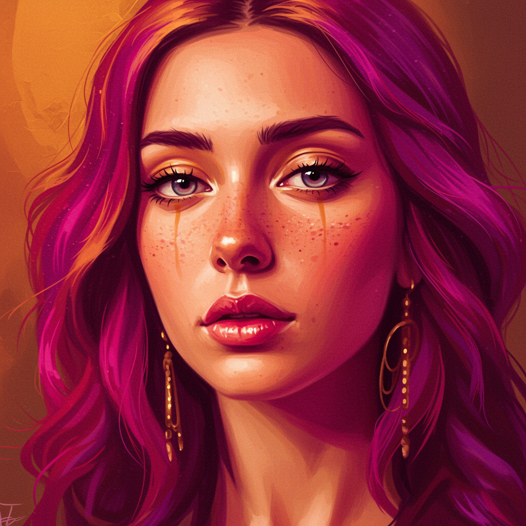Vibrant female-focused digital artwork featuring a close-up in a colorful fantasy realism style, inspired by Ivanovich Pimenov and Tanya Shatseva. The composition highlights the use of rich magenta and amber hues, exuding an exotic realism. The artwork captures intricate details and textures in ultra-high definition, embodying a raw aesthetic that enhances the visual impact.